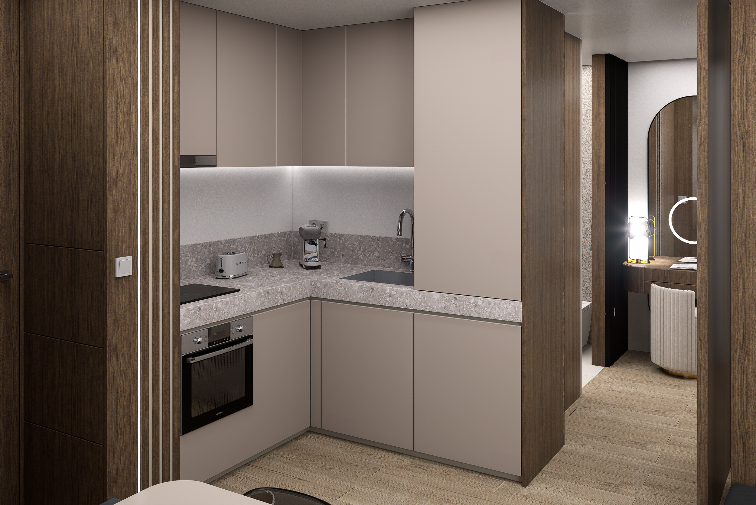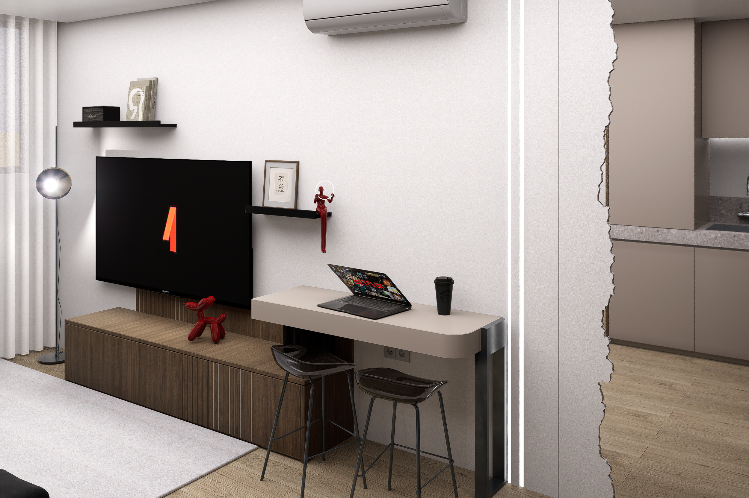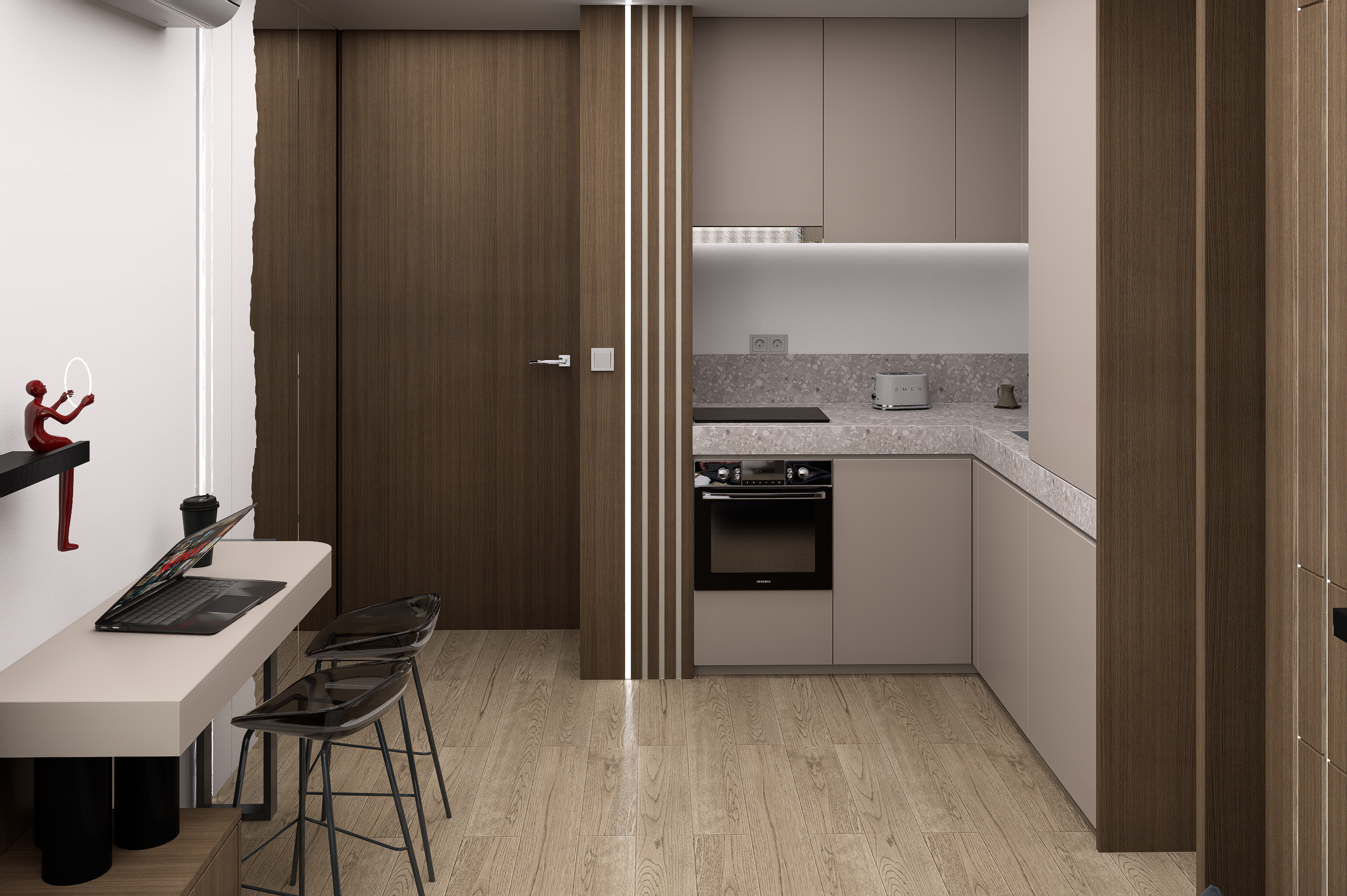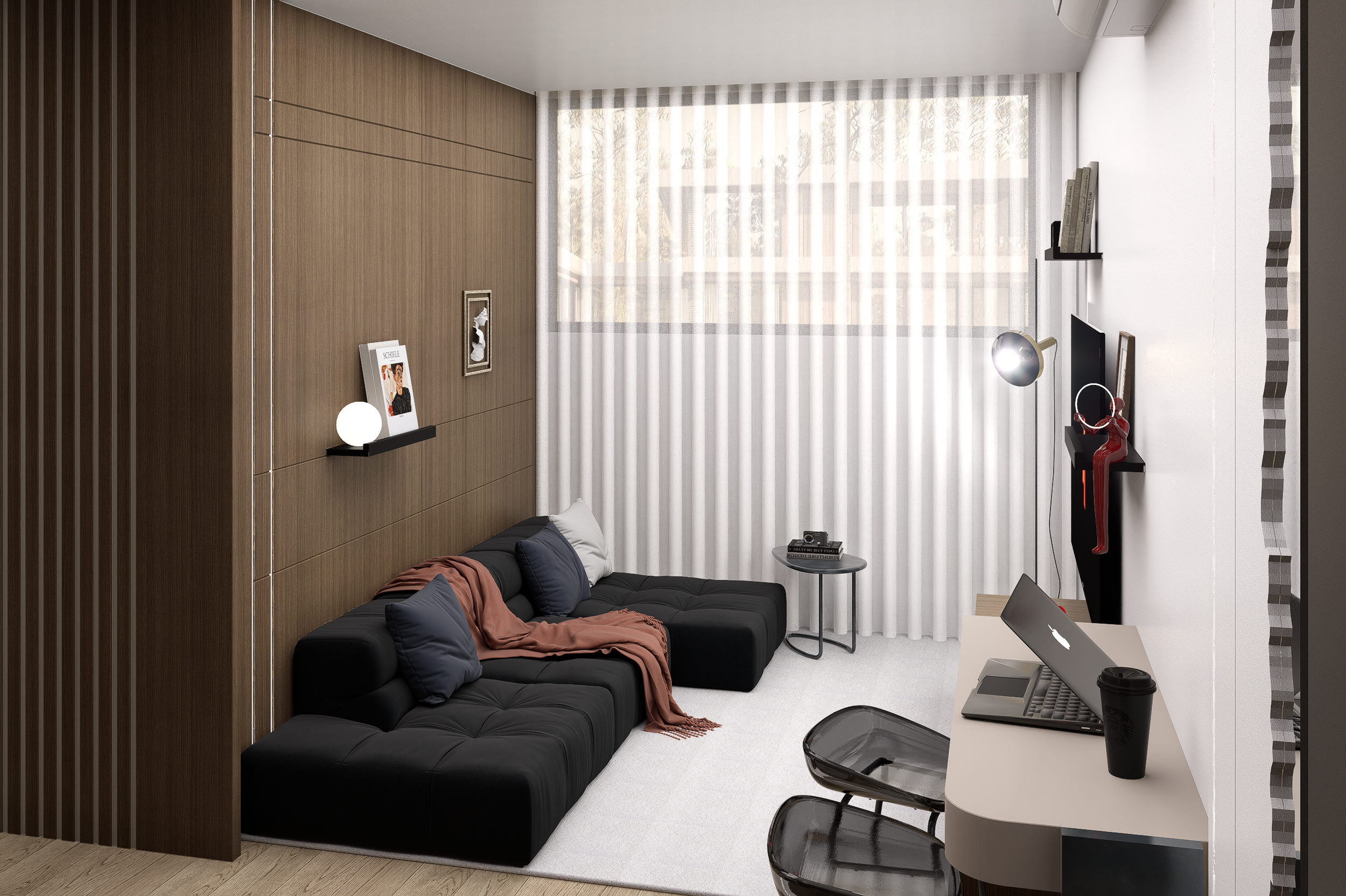Para este projeto de habitação T1, com dimensões gerais de 35m2, o foco incidiu na criação de um espaço funcional, visando no conforto e sobretudo na amplitude visual, tendo em consideração as limitações da área.