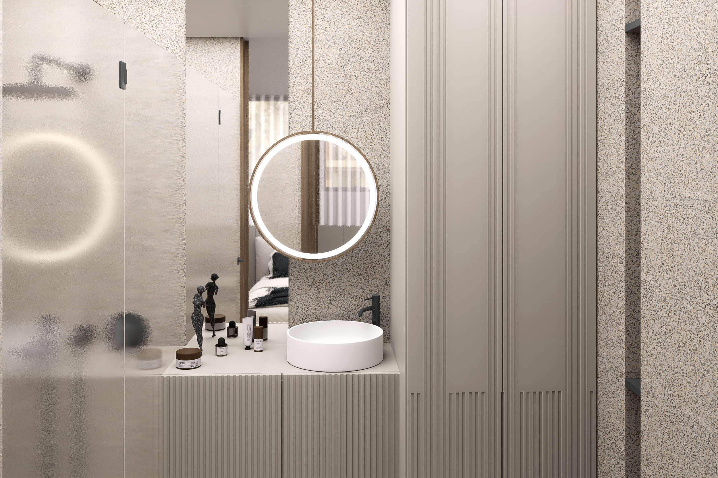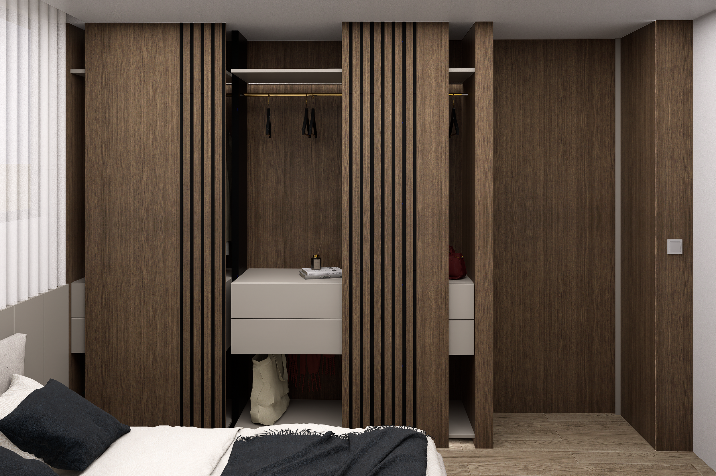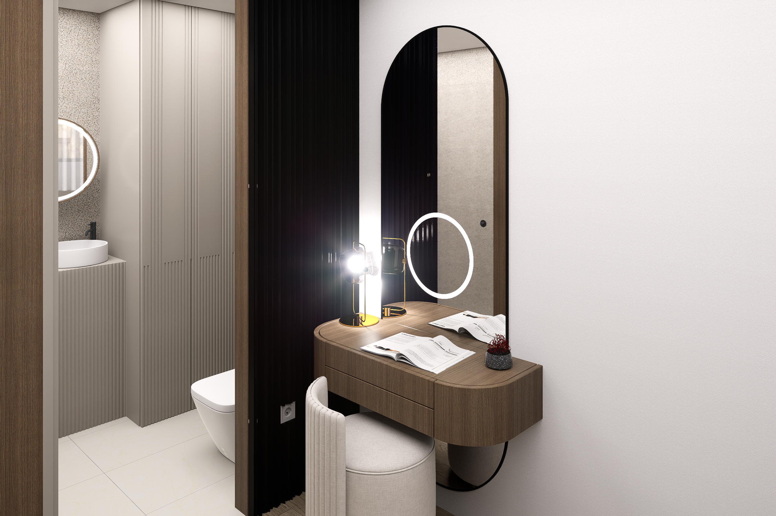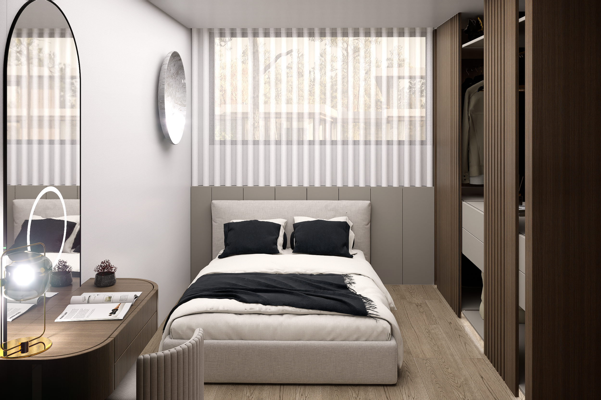 A paleta cromática eleita assenta em tons neutros claros que potenciam a luminosidade natural e ampliam a percepção do espaço. Introduziu-se madeira e apontamentos de tons escuros conjugados em texturas suaves, de forma a conferir aconchego e equilíbrio, evitando uma leitura visual fria.